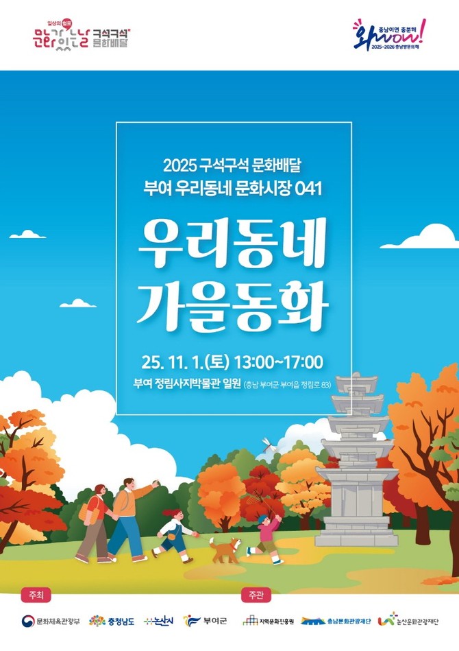 [프라임경제] 충남 부여군(군수 박정현)은 오는 11월1일 오후 1시부터 5시까지 정림사지(박물관 앞 광장) 일원에서 '2025 문화가 있는 날 <구석구석 문화배달>' 일곱 번째 이야기 '우리동네 가을동화'를 개최한다고 밝혔다.