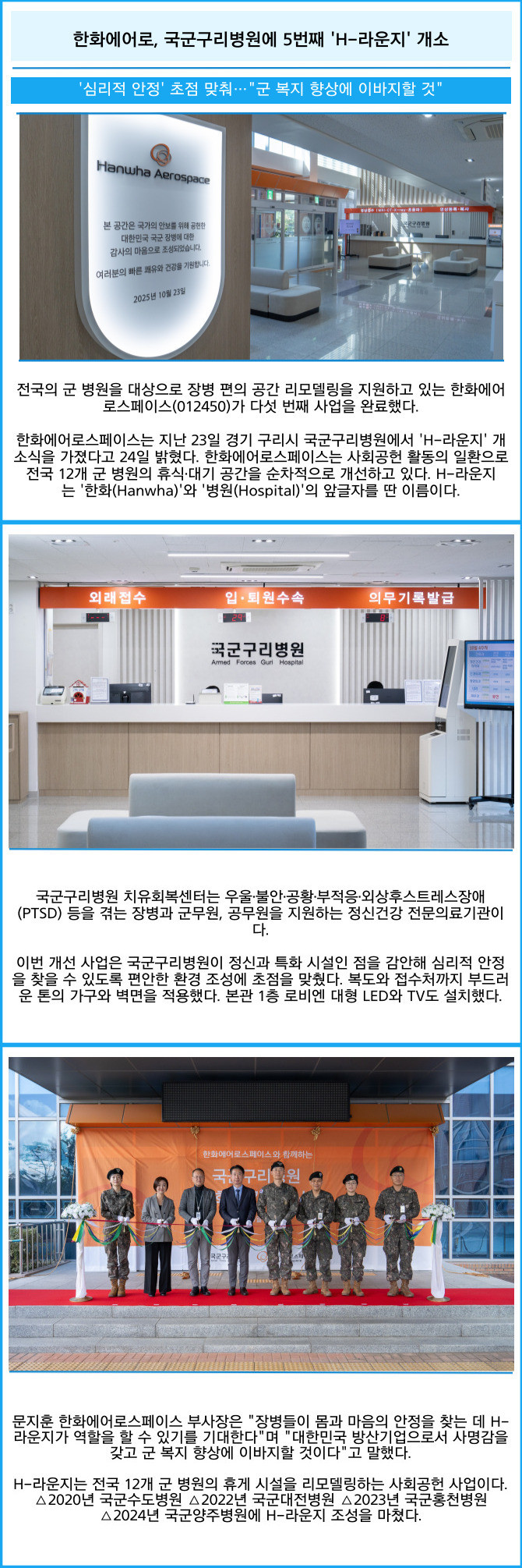 [프라임경제] 전국의 군 병원을 대상으로 장병 편의 공간 리모델링을 지원하고 있는 한화에어로스페이스(012450)가 다섯 번째 사업을 완료했다.