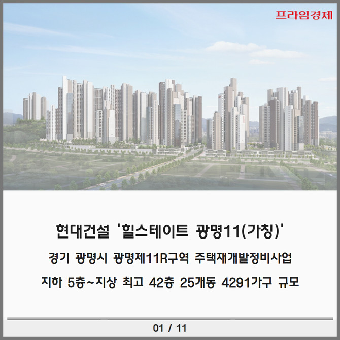 [프라임경제] 광명뉴타운 최대 규모‧최고 입지를 자랑하는 11구역에 총 4291가구 매머드급 규모의 현대건설(000720) '힐스테이트 광명11(가칭)'이 모습을 드러낸다.