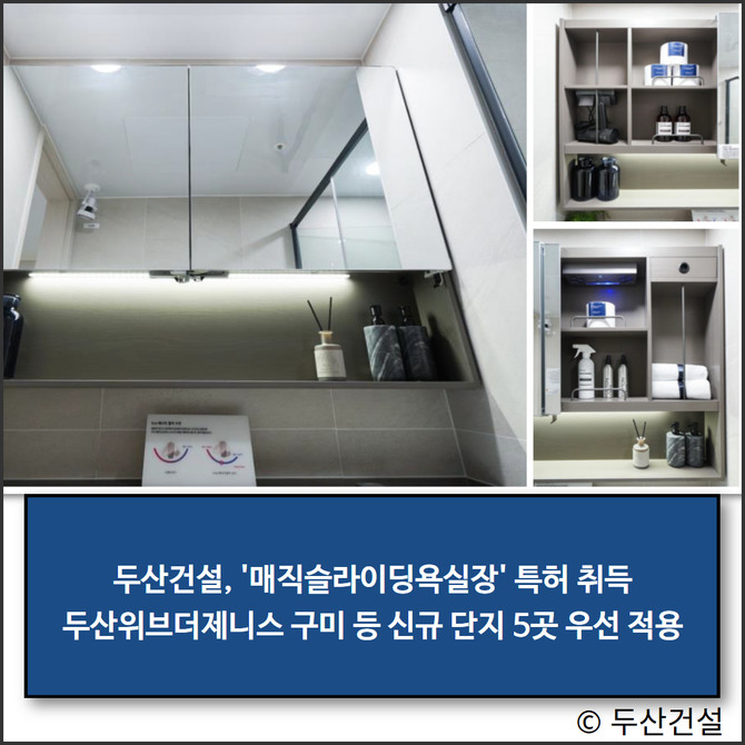 두산건설(011160)이 욕실 사용 편의성과 디자인 완성도를 높이기 위해 개발한 '매직슬라이딩욕실장'의 특허를 취득했다.