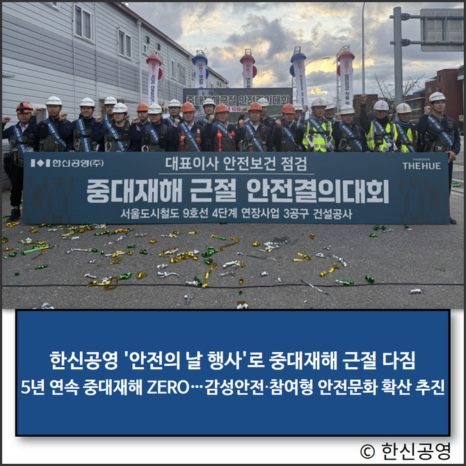 아울러 한신공영은 근로자가 스스로 안전을 실천하는 자기규율 예방체계를 구축해 감성안전 활동과 참여형 캠페인 등을 추진하고 있다. 회사는 이를 통해 5년 연속 중대재해 '제로'를 달성하고 예방 중심의 안전경영을 강화하겠다는 방침이다.