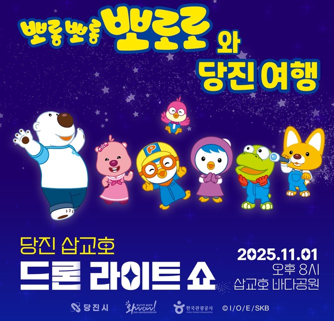 충남 당진시(시장 오성환)는 오는 11월1일 삽교호관광지 바다공원 일원에서 '뽀롱뽀롱 뽀로로와 당진 여행'을 주제로 2025 당진 삽교호 드론 라이트 쇼의 화려한 폐막 공연을 개최한다고 27일 밝혔다.