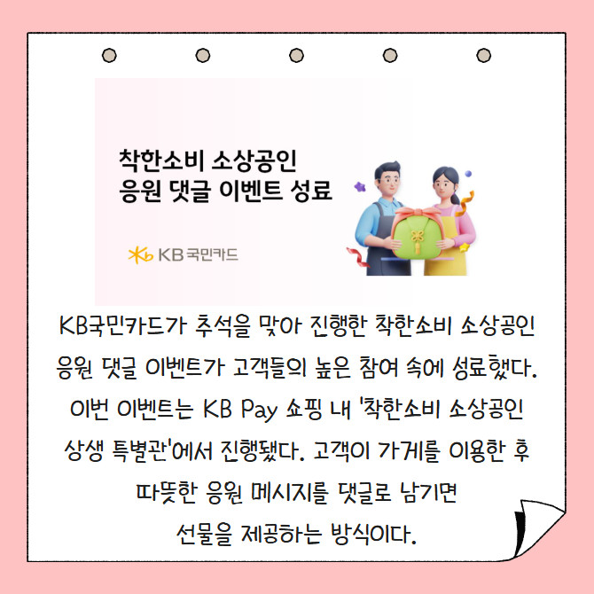 [프라임경제] KB국민카드가 추석을 맞아 진행한 착한소비 소상공인 응원 댓글 이벤트가 고객들의 높은 참여 속에 성료했다. 이번 이벤트는 KB Pay 쇼핑 내 '착한소비 소상공인 상생 특별관'에서 진행됐다. 고객이 가게를 이용한 후 따뜻한 응원 메시지를 댓글로 남기면 선물을 제공하는 방식이다.