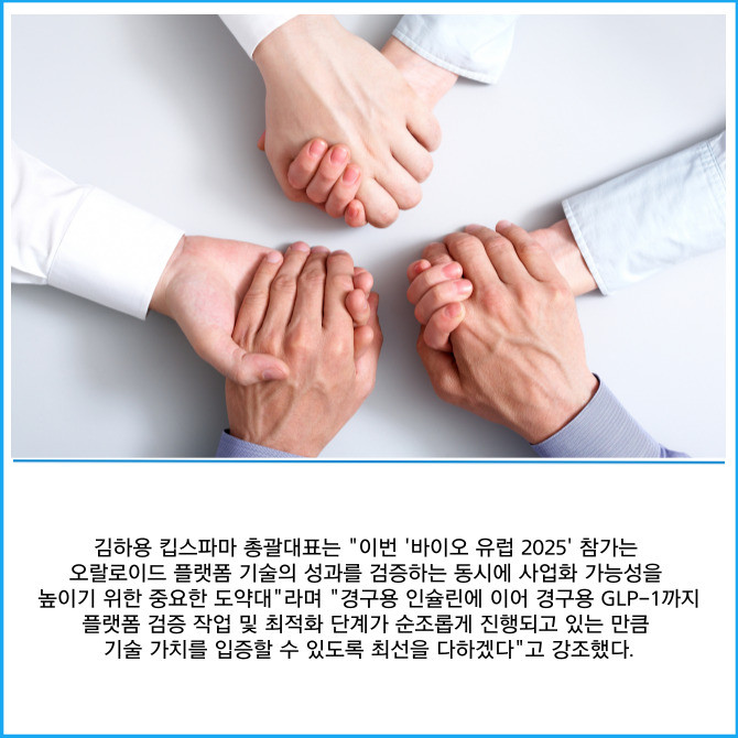 [프라임경제] 킵스바이오파마(이하 킵스파마·256940)는 경구용 플랫폼을 개발 중인 자회사 킵스바이오메드가 내달 3일부터 5일까지(현지 시간) 오스트리아 빈에서 개최되는 '바이오 유럽(BIO-Europe) 2025' 행사에 참가해 글로벌 파트너십 확장에 나선다고 27일 밝혔다.