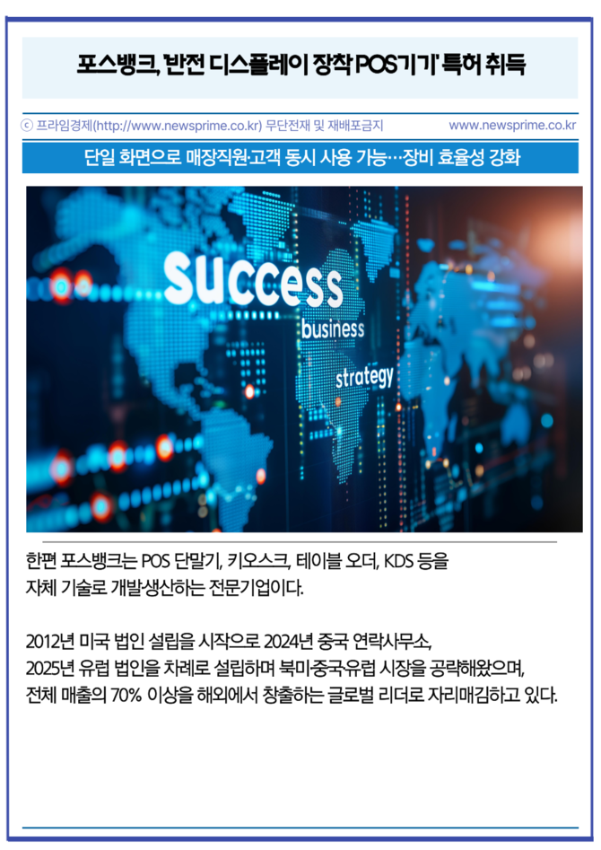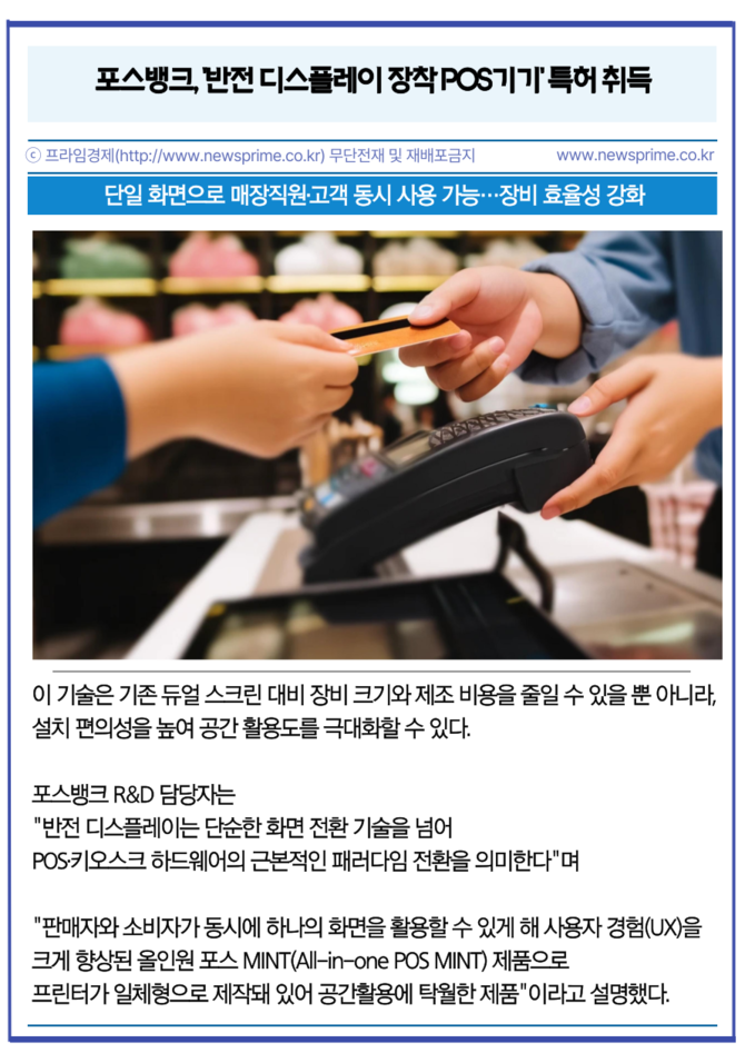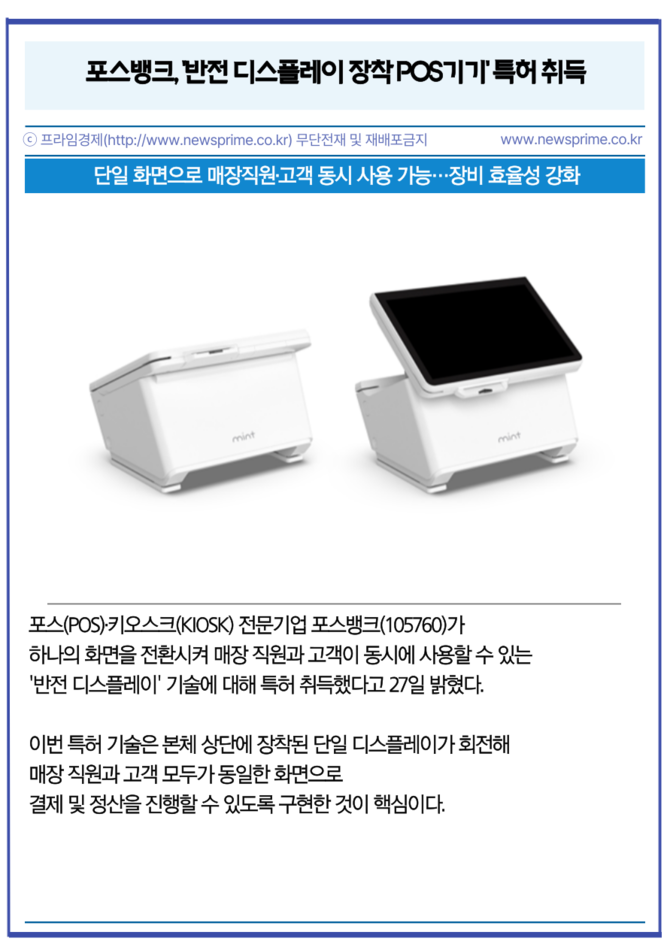 [프라임경제] 포스(POS)·키오스크(KIOSK) 전문기업 포스뱅크(105760)가 하나의 화면을 전환시켜 매장 직원과 고객이 동시에 사용할 수 있는 '반전 디스플레이' 기술에 대해 특허 취득했다고 27일 밝혔다.