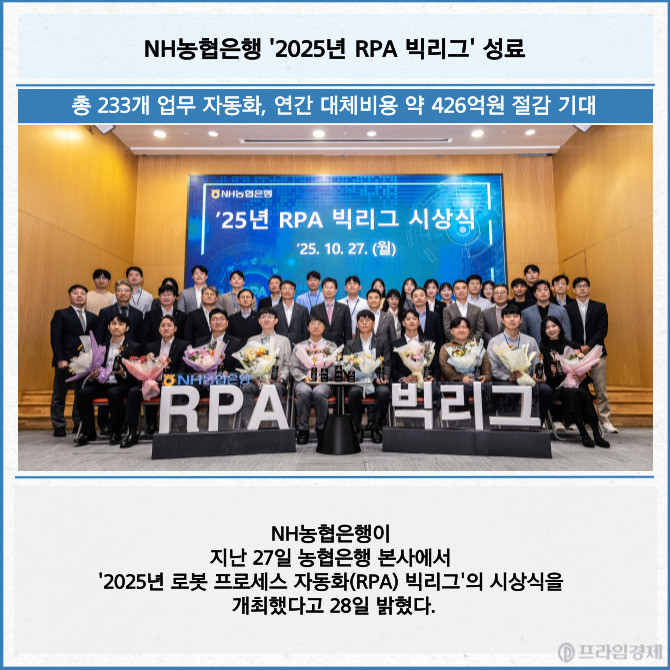 [프라임경제] NH농협은행이 지난 27일 농협은행 본사에서 '2025년 로봇 프로세스 자동화(RPA) 빅리그'의 시상식을 개최했다고 28일 밝혔다.
