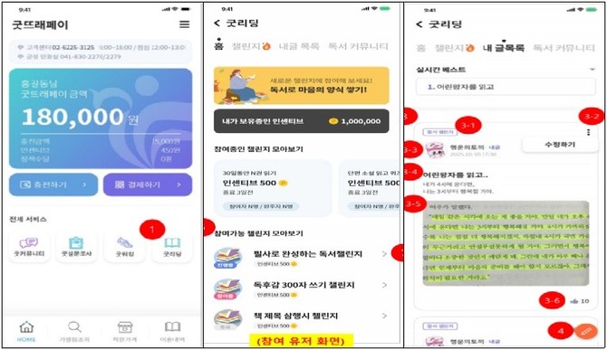'굿리딩(GoodeReading)'은 도서관과 지역화폐를 연계한 참여형 독서 플랫폼으로, 주민들이 굿뜨래페이 앱 내에서 독서 활동을 기록하고 공유하며, 챌린지 방식으로 보상을 받을 수 있는 시스템이다.