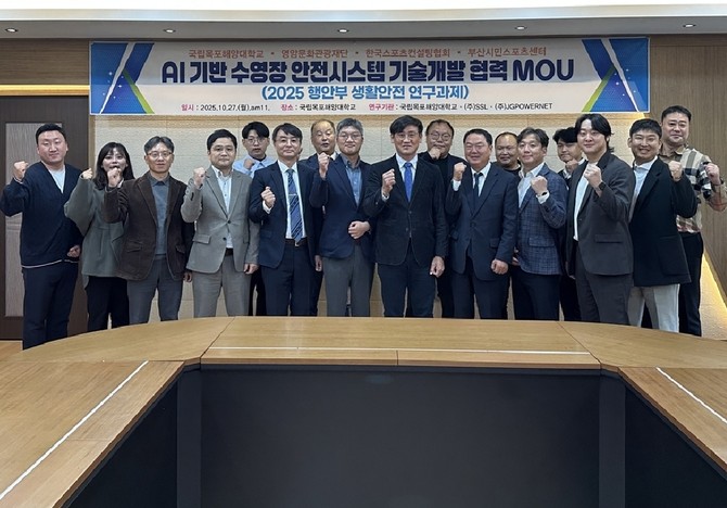 목포해양대는 27일 오전 11시 ㈜SSL, ㈜제이지파워넷, 영암문화관광재단, 한국스포츠컨설팅협회, 부산시민스포츠센터 등 총 5개 기관과 'AI 기반 수영장 안전시스템 기술개발'을 위한 협약을 맺었다고 밝혔다.
