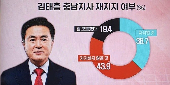 충남도민의 경우, 김태흠 충남지사 재지지 의향은 '지지하지 않겠다' 43.9%, '지지하겠다' 36.7%, '잘 모르겠다' 19.4%로 나타났다.