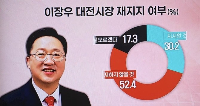 이장우 시장에 대한 재지지 의향 역시 '지지하지 않겠다' 52.4%, '지지하겠다' 30.2%, '잘 모르겠다' 17.3%로 부정 응답이 절반을 넘었다.