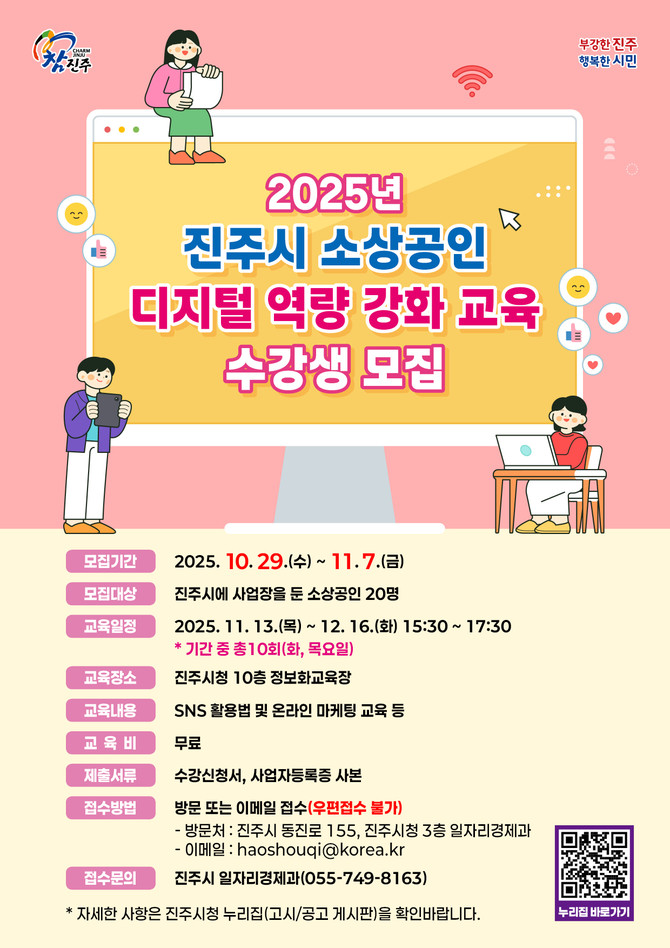 [프라임경제] 진주시가 소상공인의 온라인 활용 및 홍보 능력 향상을 위해 '2025년 진주시 소상공인 디지털 역량 강화 교육' 수강생을 모집한다.