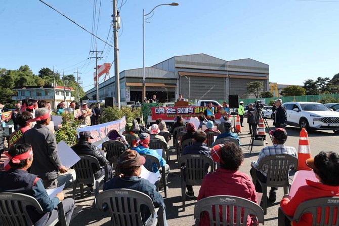 지난 10월28일 동해면 SK에코플랜트 공사현장 앞에서 수백명의 주민들이 모여 "지역 주민을 철저히 배제한 채 일방적으로 진행된 매각은 주민을 무시하는 처사 행위"라며, SK오션플랜트 매각 추진을 규탄하고 경상남도와 고성군도 공동대응에 나서야 한다고 목소리를 높였다.
