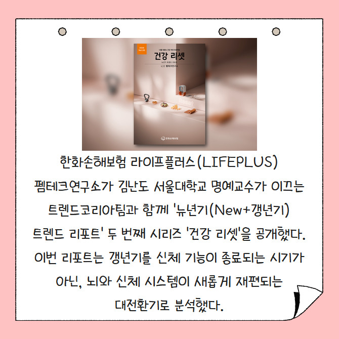 [프라임경제] 한화손해보험 라이프플러스(LIFEPLUS) 펨테크연구소가 김난도 서울대학교 명예교수가 이끄는 트렌드코리아팀과 함께 '뉴년기(New+갱년기) 트렌드 리포트' 두 번째 시리즈 '건강 리셋'을 공개했다. 이번 리포트는 갱년기를 신체 기능이 종료되는 시기가 아닌, 뇌와 신체 시스템이 새롭게 재편되는 대전환기로 분석했다.