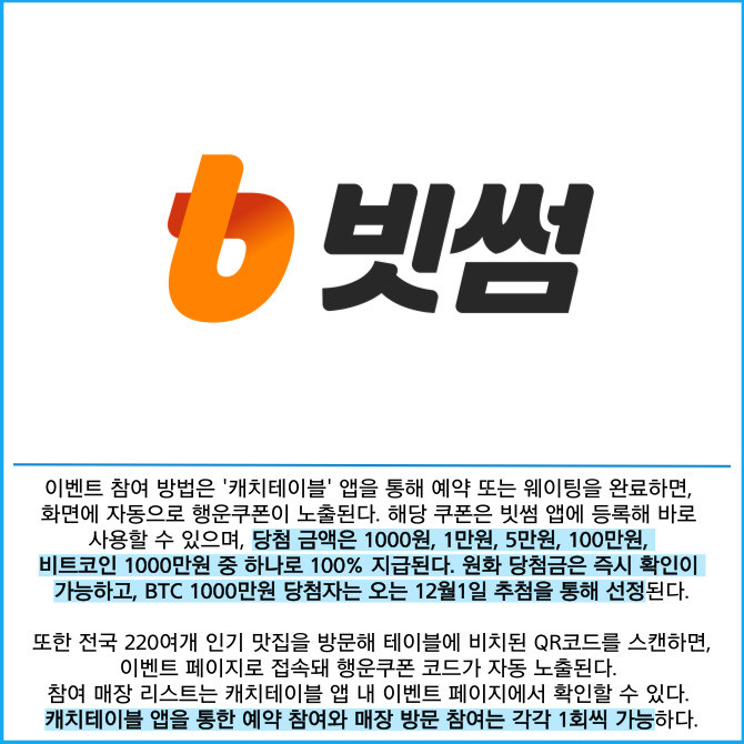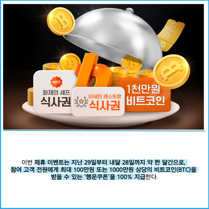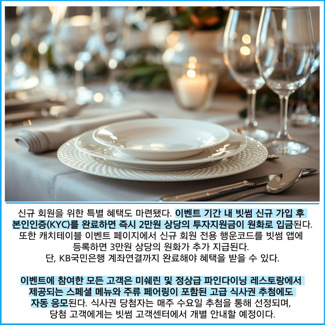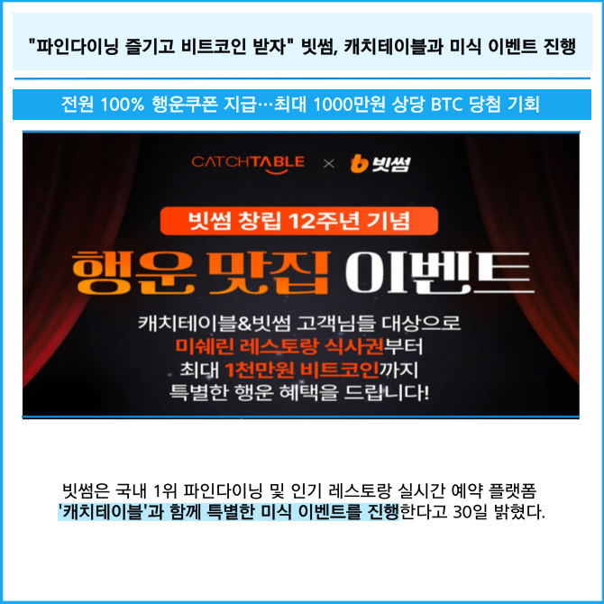 [프라임경제] 빗썸은 국내 1위 파인다이닝 및 인기 레스토랑 실시간 예약 플랫폼 '캐치테이블'과 함께 특별한 미식 이벤트를 진행한다고 30일 밝혔다.