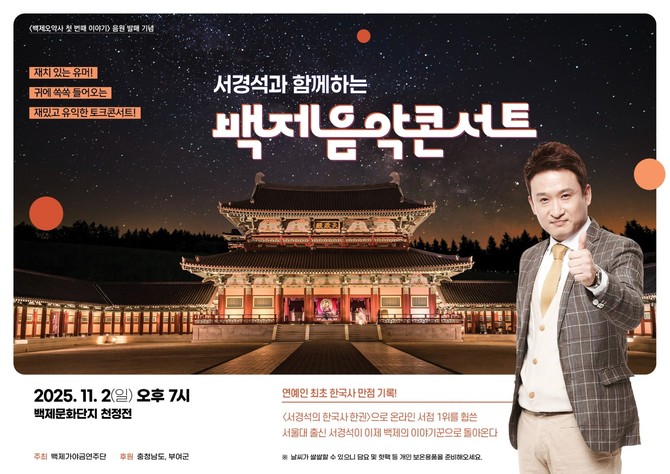 오는 11월2일 오후 7시 백제문화단지 천정전에서 백제가야금연주단(단장 김연주)이 주최하는 '2025 부여군민 함께하는 백제 음악 이야기 <서경석과 함께하는 백제 음악 콘서트>'가 개최된다.