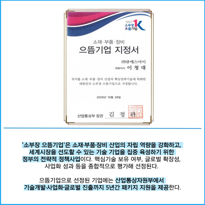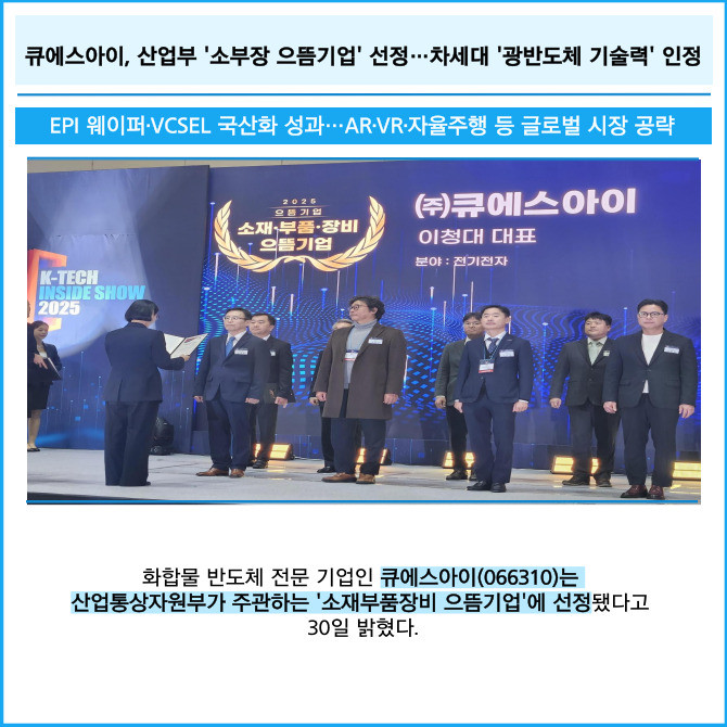 [프라임경제] 화합물 반도체 전문 기업인 큐에스아이(066310)는 산업통상자원부가 주관하는 '소재부품장비 으뜸기업'에 선정됐다고 30일 밝혔다.