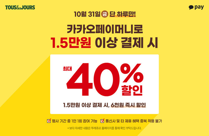 CJ푸드빌이 운영하는 뚜레쥬르가 31일 하루 동안 카카오페이머니로 결제하는 고객을 대상으로 최대 40%(최대 6000원) 할인 혜택을 제공한다.