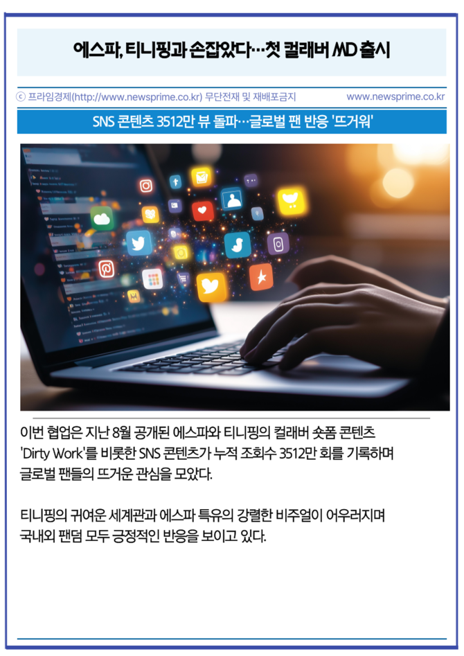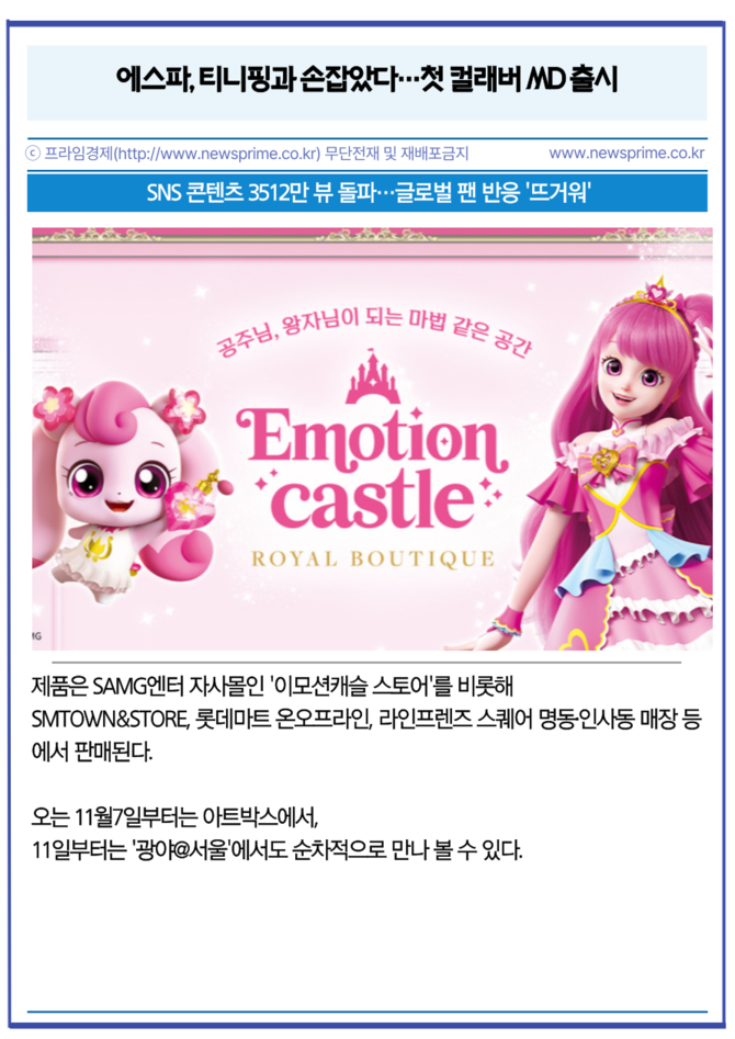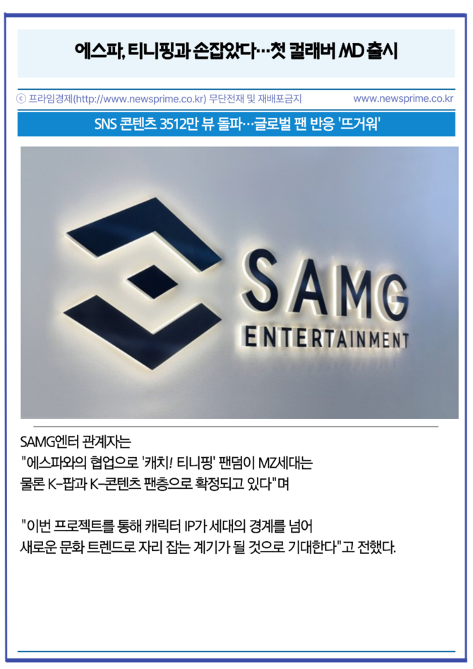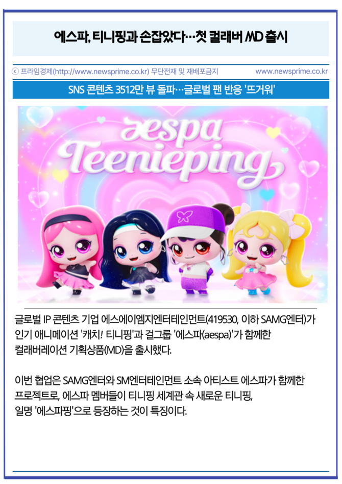 [프라임경제] 글로벌 IP 콘텐츠 기업 에스에이엠지엔터테인먼트(419530, 이하 SAMG엔터)가 인기 애니메이션 '캐치! 티니핑'과 걸그룹 '에스파(aespa)'가 함께한 컬래버레이션 기획상품(MD)을 출시했다.