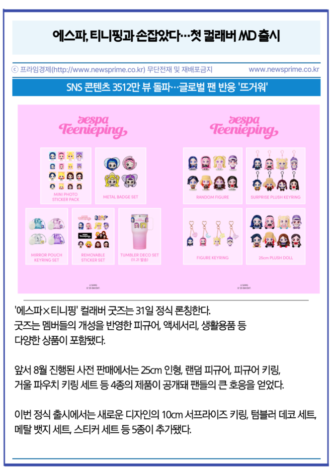 '에스파×티니핑' 컬래버 굿즈는 31일 정식 론칭한다. 굿즈는 멤버들의 개성을 반영한 피규어, 액세서리, 생활용품 등 다양한 상품이 포함됐다. 앞서 8월 진행된 사전 판매에서는 25cm 인형, 랜덤 피규어, 피규어 키링, 거울 파우치 키링 세트 등 4종의 제품이 공개돼 팬들의 큰 호응을 얻었다.
