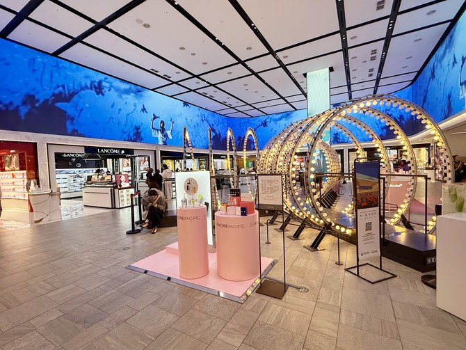 이밖에 '본투스탠드아웃(BORNTOSTANDOUT)' 등 신세계면세점 단독 입점 브랜드도 눈길을 끈다. 한국발 럭셔리 향수로 파리, 런던 등 해외 시장에서도 주목받고 있는 이 브랜드는 구조적인 오브제와 강렬한 컬러 인테리어로 시선을 사로잡았다. 백화점 1층을 연상케 하는 메이크업 시연 공간도 관광객들의 발길을 멈춰 세우는 요소 중 하나다.