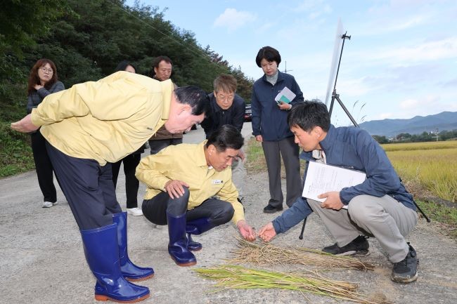 김일만 의장과 이재진 부의장, 지역구 김상백 의원 등이 함께한 이날 현장 방문은 최근 지속된 가을비와 일조량 부족으로 인한 벼·사과 농가 피해 상황을 파악하고 향후 대책 마련을 위해 마련됐다.