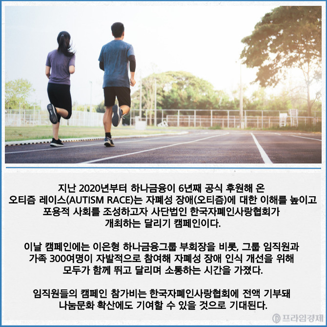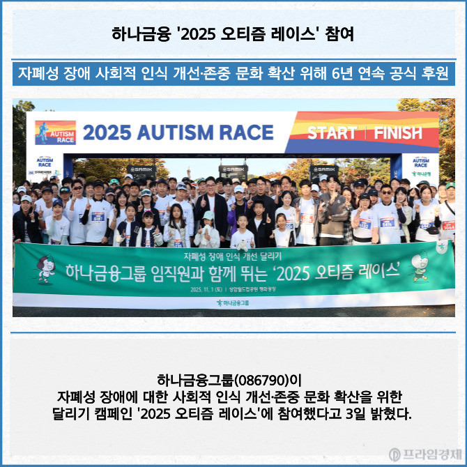 [프라임경제] 하나금융그룹(086790)이 자폐성 장애에 대한 사회적 인식 개선·존중 문화 확산을 위한 달리기 캠페인 '2025 오티즘 레이스'에 참여했다고 3일 밝혔다.