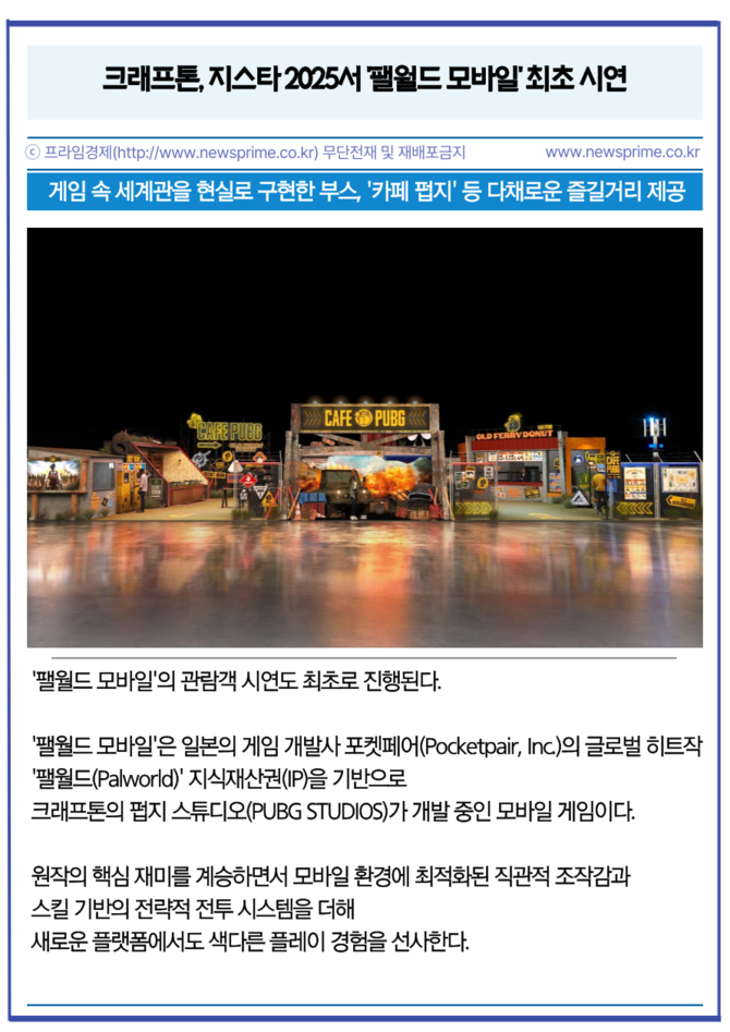 '팰월드 모바일'의 관람객 시연도 최초로 진행된다. '팰월드 모바일'은 일본의 게임 개발사 포켓페어(Pocketpair, Inc.)의 글로벌 히트작 '팰월드(Palworld)' 지식재산권(IP)을 기반으로 크래프톤의 펍지 스튜디오(PUBG STUDIOS)가 개발 중인 모바일 게임이다.