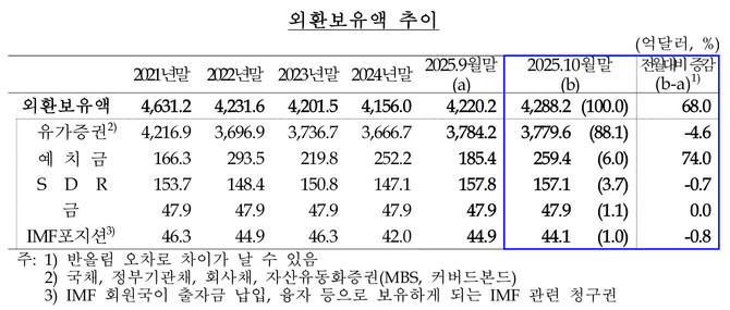 우리나라 외환보유액은 지난 5월 말 약 5년 만에 최저 수준인 4046억달러까지 줄어든 이후 5개월 연속 증가세다. 2023년 1월(4299억70000만 달러) 이후 최대 규모다.