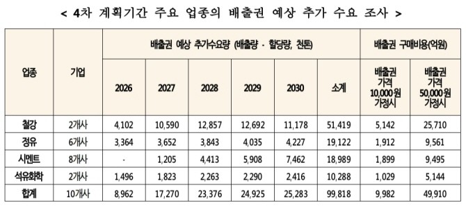 이는 배출권 가격을 5만원으로 가정해 계산할 경우, 4차 계획기간 동안 총 배출권 구매 비용이 약 5조원에 달할 것으로 예상된다.