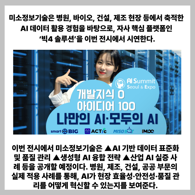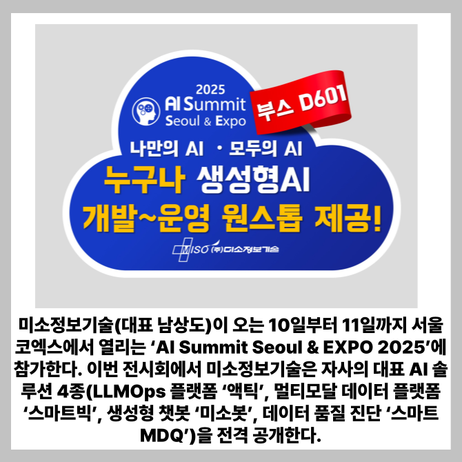 [프라임경제] 미소정보기술(대표 남상도)이 오는 10일부터 양일간 서울 코엑스에서 열리는 'AI Summit Seoul & EXPO 2025'에 참가한다고 5일 밝혔다.