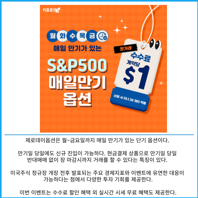 [카드] 키움증권, S&P500 '제로데이옵션' 수수료 1달러 이벤트