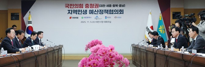 5일 대전시청에서 열린 '충청권 지역민생 예산정책협의회'에는 장동혁 국민의힘 당대표, 송언석 원내대표, 김도읍 정책위의장, 박형수 예결위 간사 등 당 지도부를 비롯해 이은권 대전시당위원장, 충청권 4개 시·도당 위원장, 이장우 대전시장, 최민호 세종시장, 김영환 충북도지사, 전형식 충남도 정무부지사 등이 참석했다.