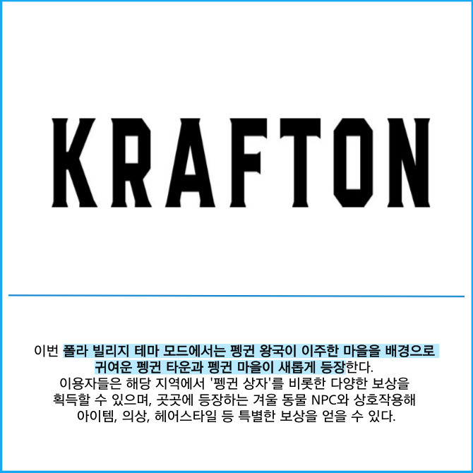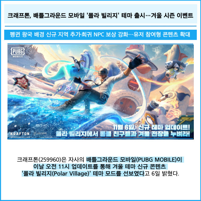 [프라임경제] 크래프톤(259960)은 자사의 배틀그라운드 모바일(PUBG MOBILE)이 이날 오전 11시 업데이트를 통해 겨울 테마 신규 콘텐츠 '폴라 빌리지(Polar Village)' 테마 모드를 선보였다고 6일 밝혔다.