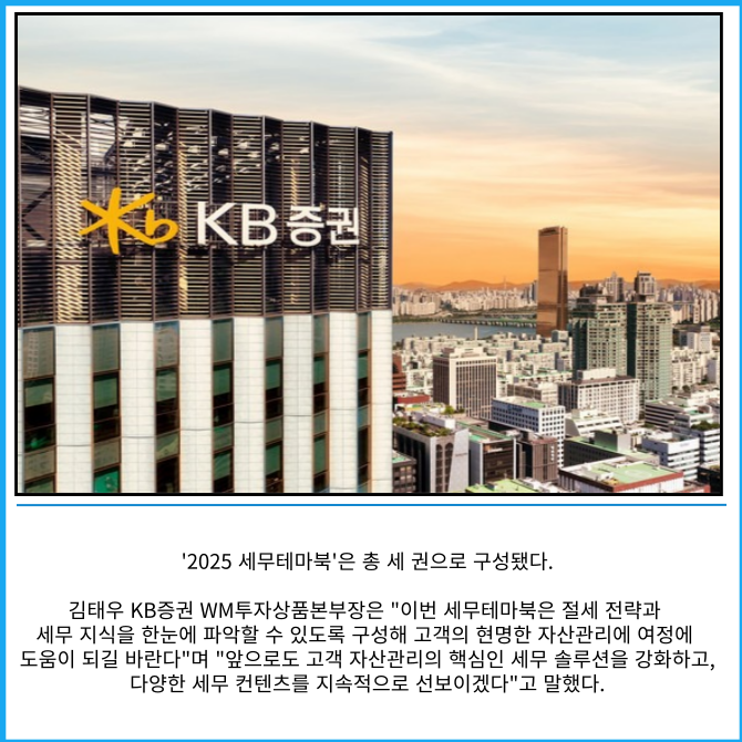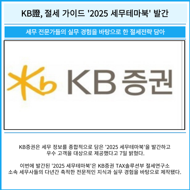 [프라임경제] KB증권은 세무 정보를 종합적으로 담은 '2025 세무테마북'을 발간하고 우수 고객을 대상으로 제공했다고 7일 밝혔다.
