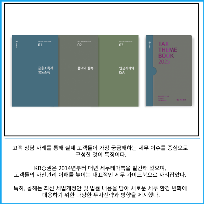 이번에 발간된 '2025 세무테마북'은 KB증권 TAX솔루션부 절세연구소 소속 세무사들의 다년간 축적한 전문적인 지식과 실무 경험을 바탕으로 제작됐다.