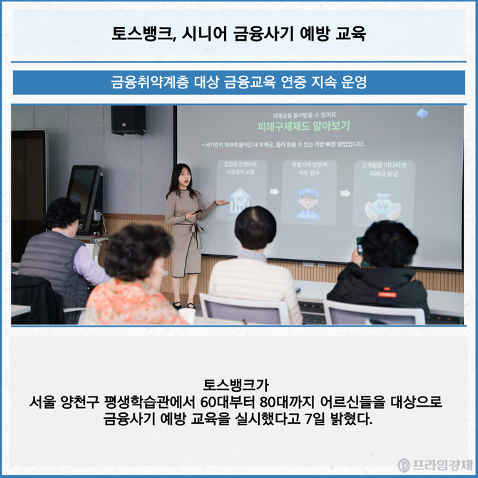 [프라임경제] 토스뱅크가 서울 양천구 평생학습관에서 60대부터 80대까지 어르신들을 대상으로 금융사기 예방 교육을 실시했다고 7일 밝혔다.