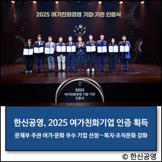 한신공영(004960)은 문화체육관광부가 인증하는 '2025년 여가친화기업'에 선정됐다고 7일 밝혔다. 여가친화기업 인증제는 근로자가 일과 여가를 균형 있게 유지할 수 있도록 제도적 환경을 조성한 기업을 대상으로 매년 부여된다.
