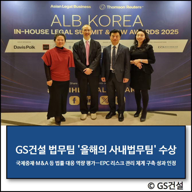 GS건설(006360)은 글로벌 법률 전문매체 ALB가 주관하는 '2025 한국법률대상'에서 올해의 사내법무팀상을 수상했다고 7일 밝혔다. 이번 시상식에서 국내 대형건설사 중 GS건설이 유일하게 수상 영예를 안았다.