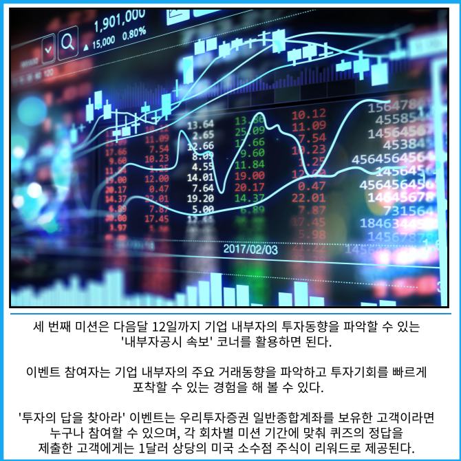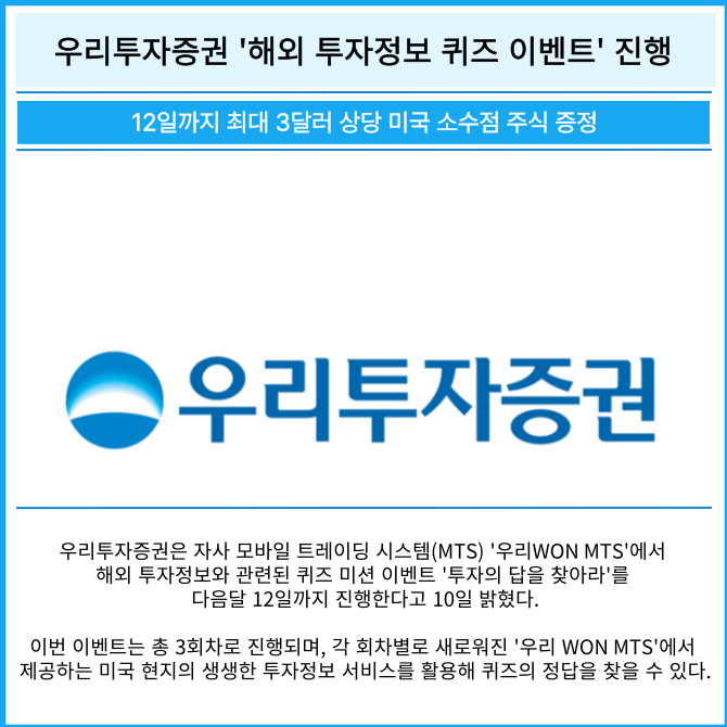 [프라임경제] 우리투자증권은 자사 모바일 트레이딩 시스템(MTS) '우리WON MTS'에서 해외 투자정보와 관련된 퀴즈 미션 이벤트 '투자의 답을 찾아라'를 다음달 12일까지 진행한다고 10일 밝혔다.