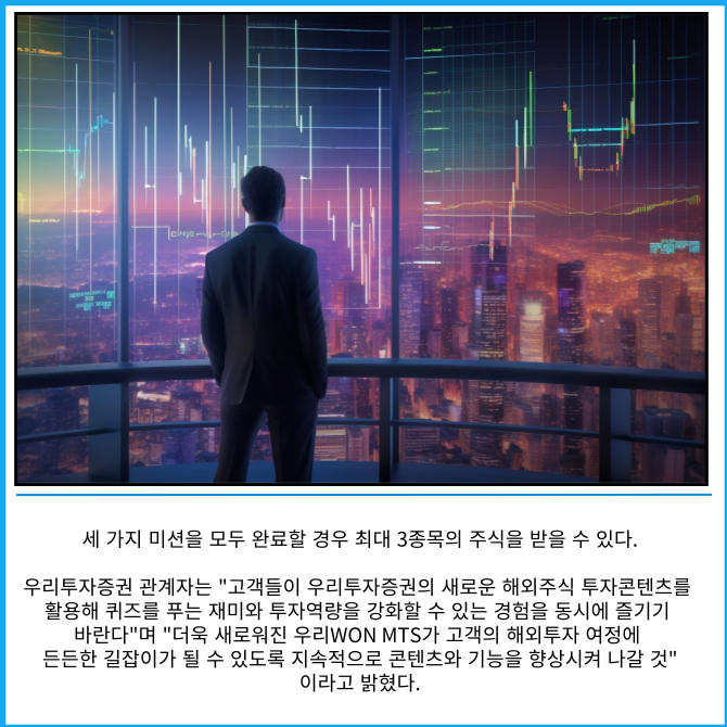이번 이벤트는 총 3회차로 진행되며, 각 회차별로 새로워진 '우리 WON MTS'에서 제공하는 미국 현지의 생생한 투자정보 서비스를 활용해 퀴즈의 정답을 찾을 수 있다.