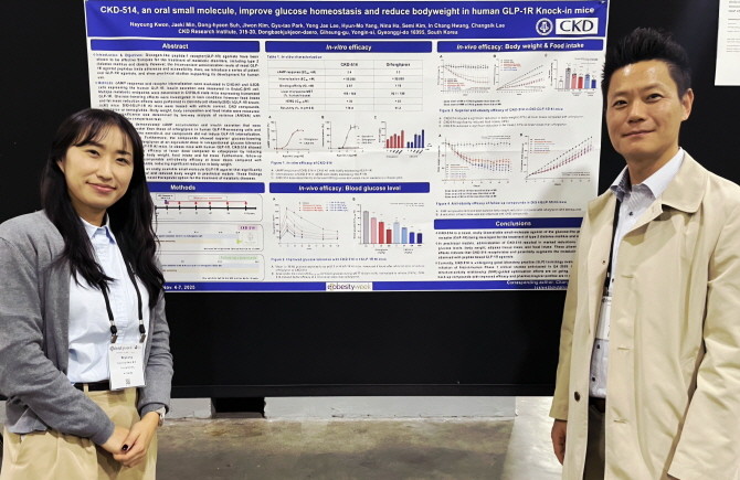 4일 미국 애틀란타에서 열린 '2025 미국비만학회(2025 Obesity Week)'에서는 경구용 GLP-1 수용체 작용제(GLP-1RA)신약 후보물질‘CKD-514'의 비임상 연구 성과를 발표했다. CKD-514는 용해도 개선을 통한 구조적 이점을 바탕으로 대동물 모델에서 우수한 경구 생체이용률(Dog BA)을 보였으며, 경구용 비만치료제 오포글리프론(Orforglipron) 대비 적은 용량에서 유의한 체중 감소 효과와 동일 용량 대비 우수한 혈당 강하 효과를 나타냈다. CKD-514의 후속 화합물군 역시 오포글리프론과 세마글루타이드(Semaglutide)와의 비교 시험에서 두 약물과 동등하거나 우월한 대사 개선 효과가 있음을 확인했다. 복용 편의성이 높은 경구 제형 비만치료제 개발에 성공한다면, 주사형 비만 치료제가 주류를 이루는 글로벌 시장에서 차별성과 경쟁력을 확보할 것으로 기대된다.