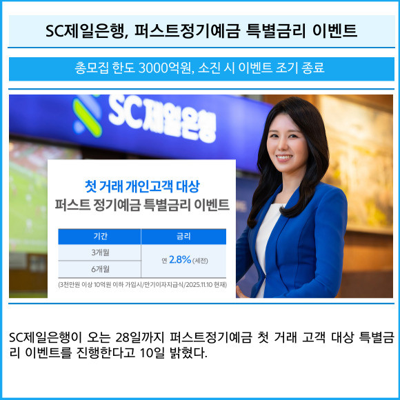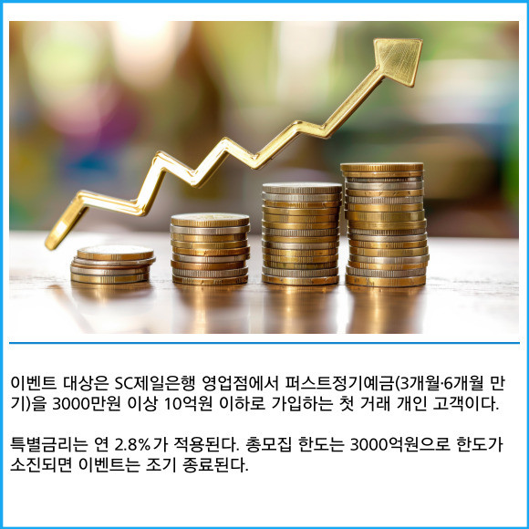 [프라임경제] SC제일은행이 오는 28일까지 퍼스트정기예금 첫 거래 고객 대상 특별금리 이벤트를 진행한다고 10일 밝혔다.