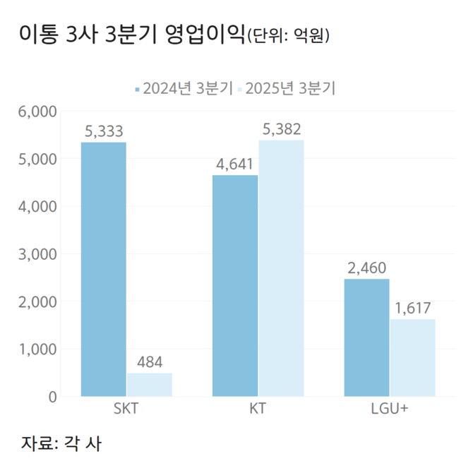 통신 업계에 따르면 SK텔레콤(017670)·KT(030200)·LG유플러스(032640)의 3분기 합산 영업이익(연결 기준)은 총 7483억원에 그쳤다. 이는 전년 동기 대비 40%가량 감소한 수치다.