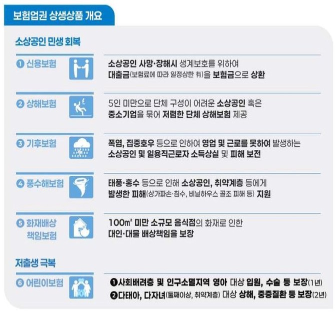 이번 사업은 보험료 '전액 지원'이 핵심이다. 보험업권은 상생보험 운영을 위해 이미 300억원의 기금을 조성했다. 생명보험사와 손해보험사가 각각 150억원씩 부담하는 방식으로, 정부 예산이 투입되지 않는 민관 협력 모델이다. 지원 대상 보험상품은 신용보험·상해보험·기후보험·풍수해보험·화재배상책임보험·어린이보험 총 6종이다.