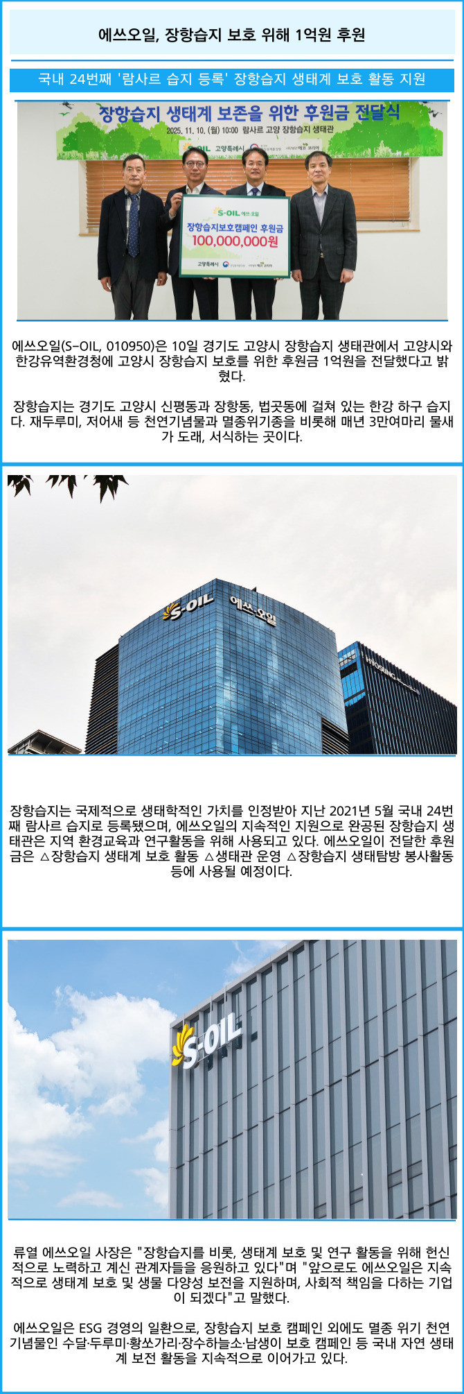 [프라임경제] 에쓰오일(S-OIL, 010950)은 10일 경기도 고양시 장항습지 생태관에서 고양시와 한강유역환경청에 고양시 장항습지 보호를 위한 후원금 1억원을 전달했다고 밝혔다.