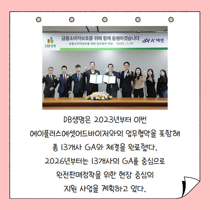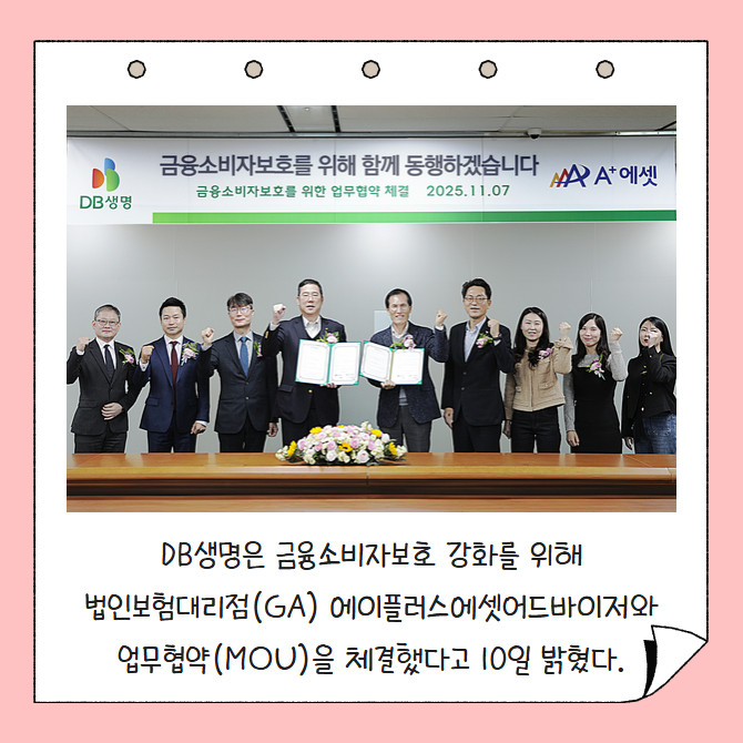[프라임경제] DB생명은 금융소비자보호 강화를 위해 법인보험대리점(GA) 에이플러스에셋어드바이저와 업무협약(MOU)을 체결했다고 10일 밝혔다.
