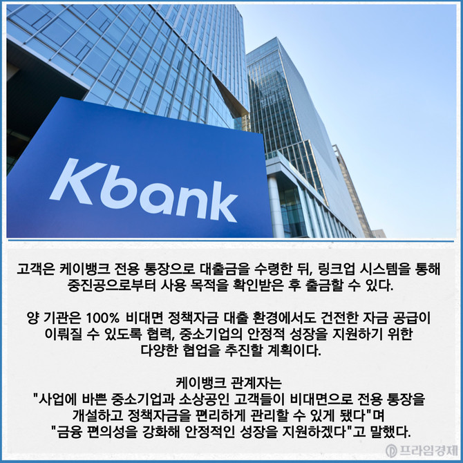 [프라임경제] 케이뱅크가 중소벤처기업진흥공단(이하 중진공) 정책자금 대출 고객을 위한 100% 비대면 '중진공 정책자금 전용 통장'을 은행권 최초로 출시했다고 11일 밝혔다.