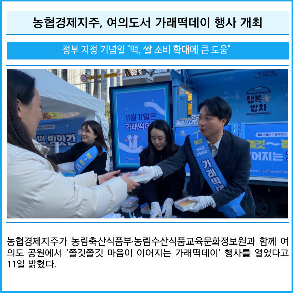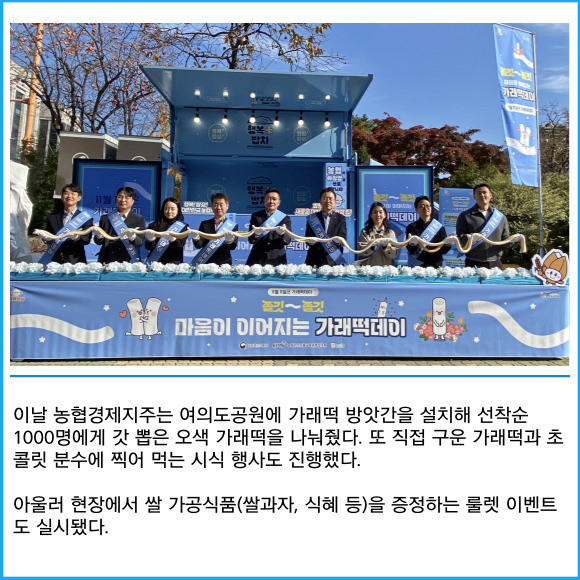 [프라임경제] 농협경제지주가 농림축산식품부·농림수산식품교육문화정보원과 함께 여의도 공원에서 '쫄깃쫄깃 마음이 이어지는 가래떡데이' 행사를 열었다고 11일 밝혔다.