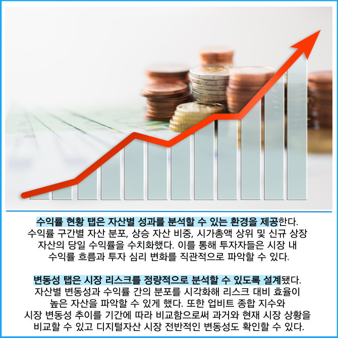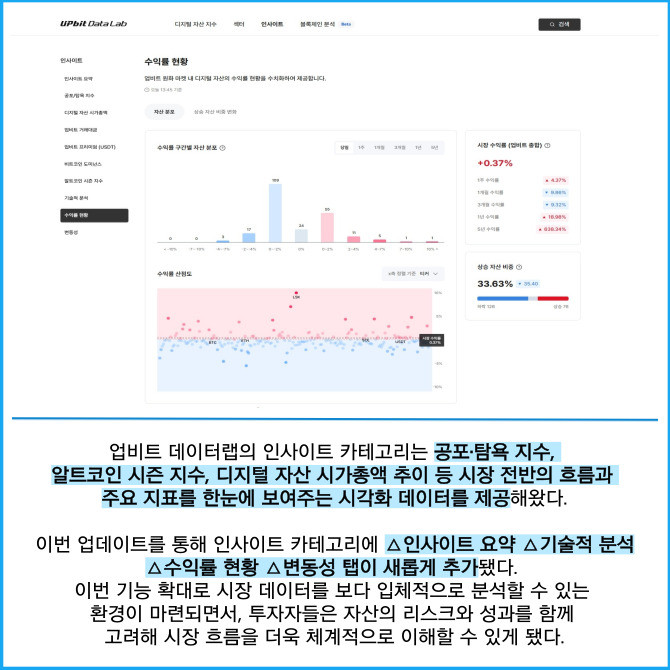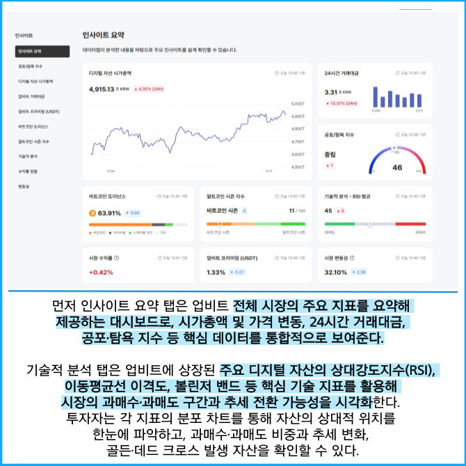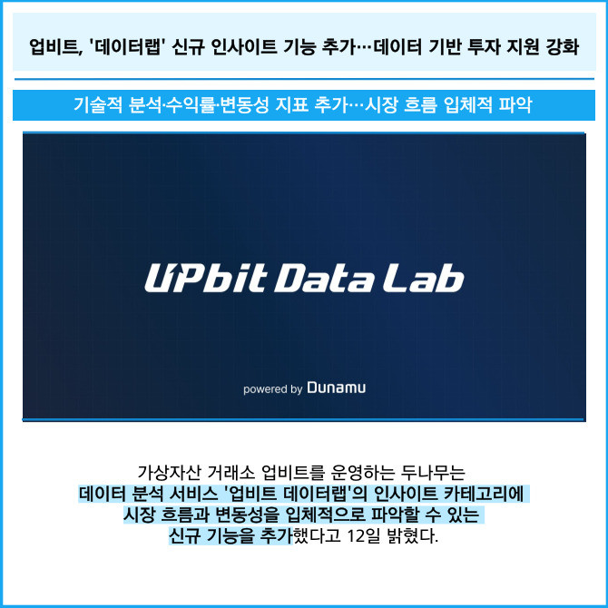 [프라임경제] 가상자산 거래소 업비트를 운영하는 두나무는 데이터 분석 서비스 '업비트 데이터랩'의 인사이트 카테고리에 시장 흐름과 변동성을 입체적으로 파악할 수 있는 신규 기능을 추가했다고 12일 밝혔다.