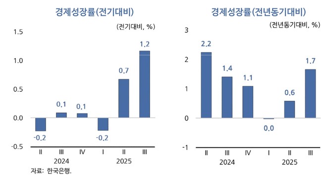 [프라임경제] 내수가 살아나며 경기 회복세가 완만하게 이어지자 경제성장률도 상향 조정됐다. 시중금리 하락과 재정 지원이 맞물리며 소비가 개선되고 있다는 분석이다. 다만 내년에는 미국의 관세 인상 여파로 수출 둔화가 예상돼 성장세가 다소 제한될 여지는 남아 있다.